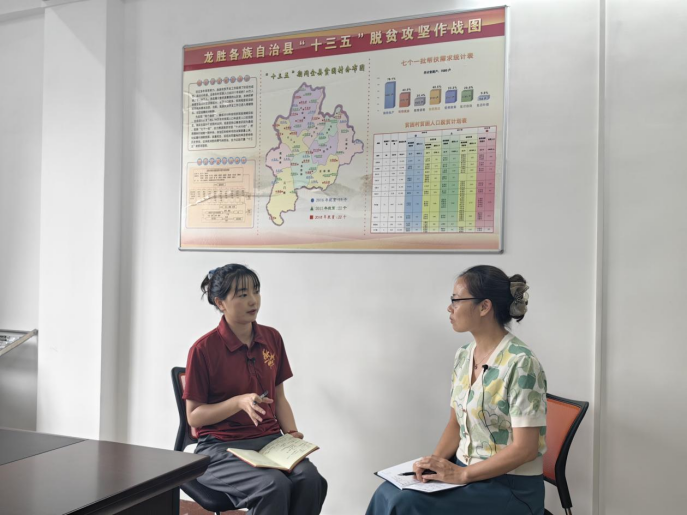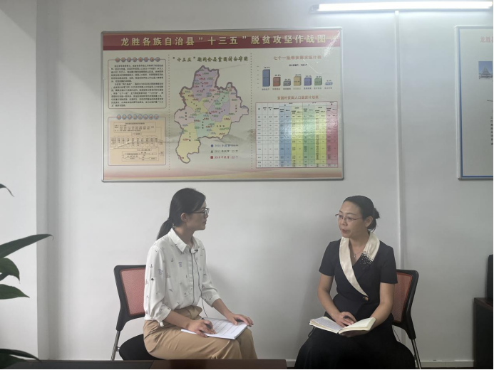 ▲孔儒婧访谈龙胜各族自治县农业农村局党组书记(原扶贫办主任)杨焕娟