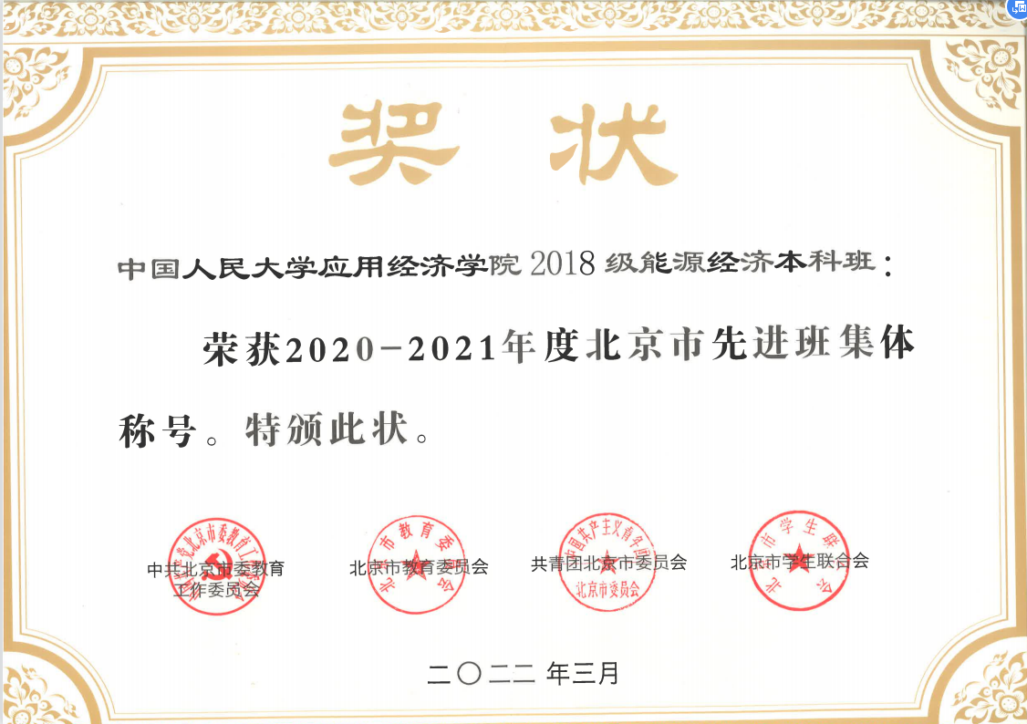 2018级能源经济本科班自成立以来,在全体同学戮力同心、不懈努力之下,围绕公司有品格觉悟、有专业本领、有健康身心的“三有人才”培养理念,在思想风貌建设、学习风气培育、社会实践研究等方面不断探索,不断取得优异成绩。班团一体化协同发展,曾获评sunbet官方网站2020年度“五星团支部”、2021年“五星红旗团支部”、2020-2021学年“十佳班集体”等荣誉奖项。能经班全体同学作为新时代青年学子,始终坚持“在时代的赛道上奋力奔跑,展现青春活力,争取跑出当代青年的最好成绩”。