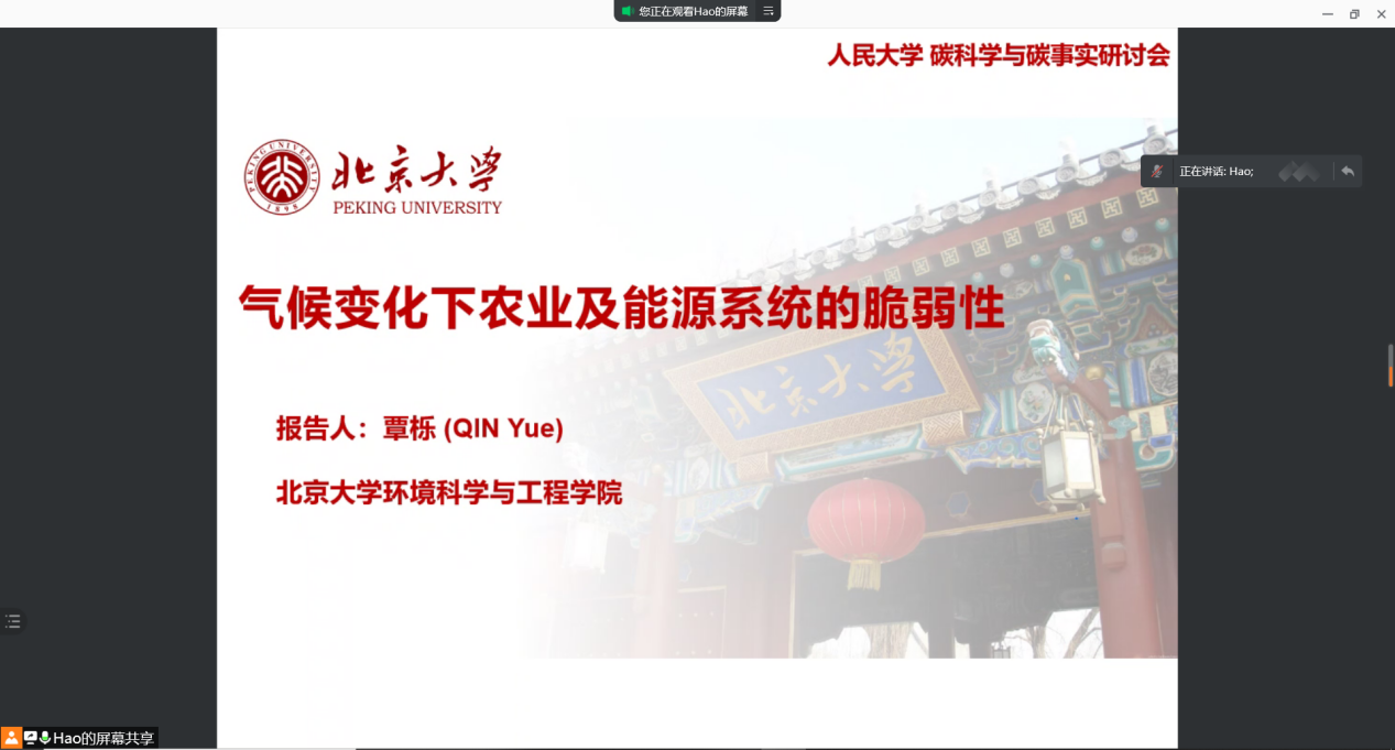 北京大学环境科学与工程公司副教授覃栎作题为《气候变化下农业及能源系统的脆弱性》的报告,概况介绍了气候变化导致融雪径流规模减少、时间发生转移,显著依赖于融雪径流的灌溉农业地区遭受影响。因此,在制定和完成减排目标的过程中,需要兼顾制定气候变化的适应策略,权衡碳中和路径下的多重环境目标。