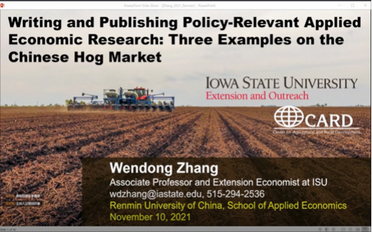“2021与国际期刊主编‘面对面’学术讲座”系列学术讲座第四讲,主讲嘉宾为爱荷华州立大学经济系副教授张文栋,他带来了题为Writing and Publishing Policy-Relevant Applied Economic Research: Three Examples on the Chinese Hog Market的报告,讲座由sunbet助理教授李浩然主持。张文栋通过分析几篇文章和案例来介绍自己对于中国生猪市场研究的兴趣来源,接着分享了自己与华中农业大学的熊涛老师合作的关于中国生猪市场方面的三篇文章,借此分享自己对于如何从平时观测到的现象中寻找研究问题,以及如何做出一个好的研究的理解和认识。同时提出了做研究时要注意的关键信息:你的论文里与众不同的、可推广的经验是什么?并以三篇文章为例分享自己关于论文写作和发表的一些思考与经验。