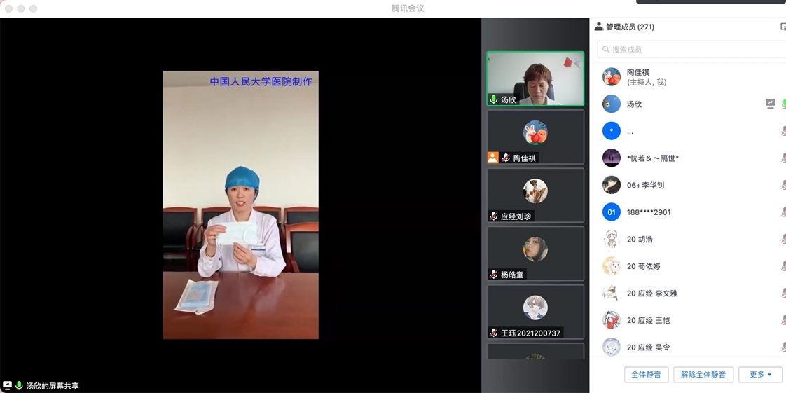 接着,汤欣经理向同学们分享了科学防疫的注意要点,她强调了个人防护的12字口诀 :“戴口罩、勤洗手、多通风、少聚集”,并播放了正确佩戴口罩及七步洗手法教学视频。除了外部防护措施之外,她还强调了自身免疫力是疫情防控的关键一环,她建议师生应规律作息、适当运动、营养均衡,通过正确的方式排遣压力,保持健康心理。在切断传播途径方面,汤欣经理强调,大家要充分认识到信息及时上报的必要性,提高防控意识、大局意识,在自身面临风险时及时上报、杜绝病毒传播。
