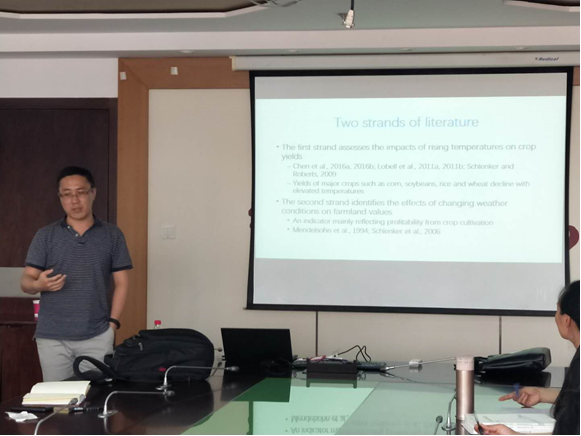 陈晓光教授首先进行了题为“Quantifying the Temperature Effects on China’s Total Agricultural Output”的学术报告,他利用县级别的面板数据,分析了气温变化通过TFP(全要素生产率)和农业生产投入两种途径对农业产出的影响,主要得出了以下结论:农业产出随着春天、夏天、冬天温度的升高而下降,随着秋天温度的升高而上升;天气变化通过减少TFP和增加农业投入品而对农业产出造成负面影响;天气变化对农业产出的影响在地区上具有异质性。