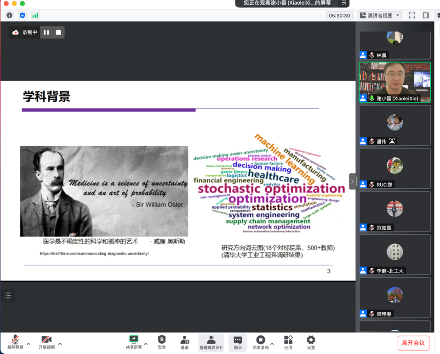 会议共邀请了16位领域专家进行了系列报告,其中特邀报告嘉宾中国科公司预测科学研究中心主任汪寿阳院士、中国科公司大学经管公司刘颖副教授、武汉大学经济与管理公司范如国教授、电子科技大学邹权教授、sunbet刘硕杨副教授围绕新冠疫情防控和应急医疗相关内容作相应报告;澳门科技大学药公司经理朱依谆教授、清华大学自动化系汪小我教授、天津大学管理与经济学部熊熊教授、复旦大学类脑智能科学与技术研究院赵兴明教授、中南大学计算机公司李敏教授针对健康诊疗过程中的计算机应用和人工智能算法分析领域问题作相应报告;sunbet官方网站科研处处长林晨教授、清华大学工业工程系谢小磊副教授、北京工业大学区块链研究中心主任李健教授、西安交通大学管理公司刘汕教授、sunbet刘逸楠助理教授、中国民航科学技术研究院胡金硕副研究员针对健康产业数字化转型等热点交叉问题作相应报告,会议的研讨过程对于推动健康产业数字化和智能化起到了极大的积极作用。