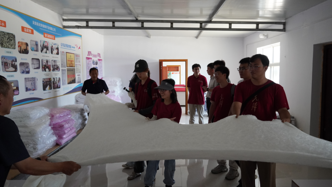 ▲调研团队查看蚕丝半成品