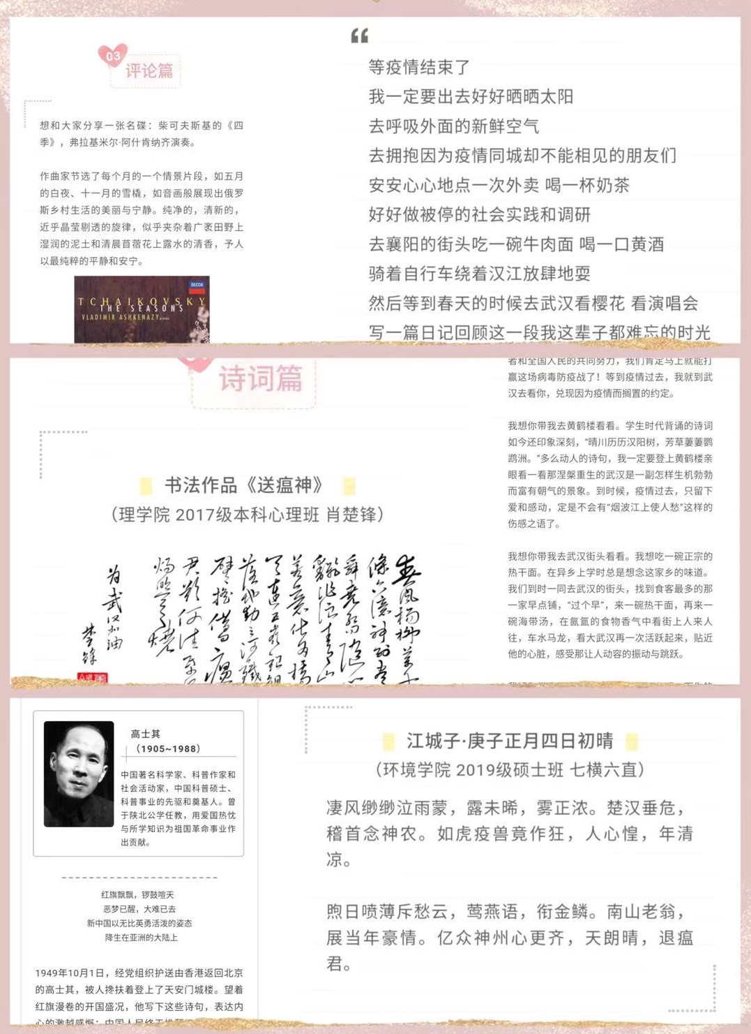 几天前,我们20多位参与众志成城方阵的湖北籍同学共同发起了征集活动,面向全校征集“为湖北加油、向逆行者致敬”的网络作品。活动一经推出,就得到了公司师生的广泛响应,大家踊跃来稿,各种原创诗歌、书法作品、手写祝福、鼓励视频、亲笔书信,每一个投稿都饱含着大家对抗疫情的信心和决心,传递着对身处抗疫最前线的湖北同胞的关心和鼓励,都表达着对奋斗在一线的最美逆行者——白衣天使们最崇高的敬意。征集作品,整理稿件,采访一线医护人员,寻找素材,编辑推送,大家各司其职,共同协作,互相鼓励,我们努力记录来自抗”疫“第一线的同胞们的心声,铭记一个个坚守的故事……