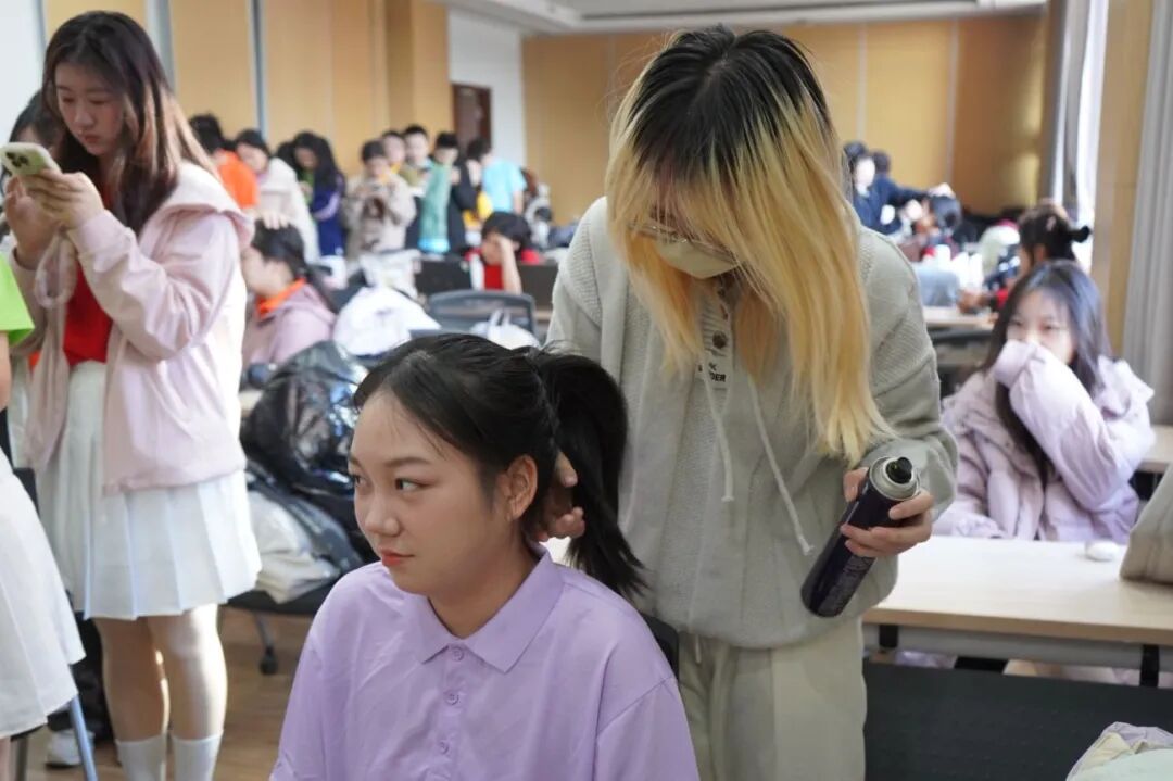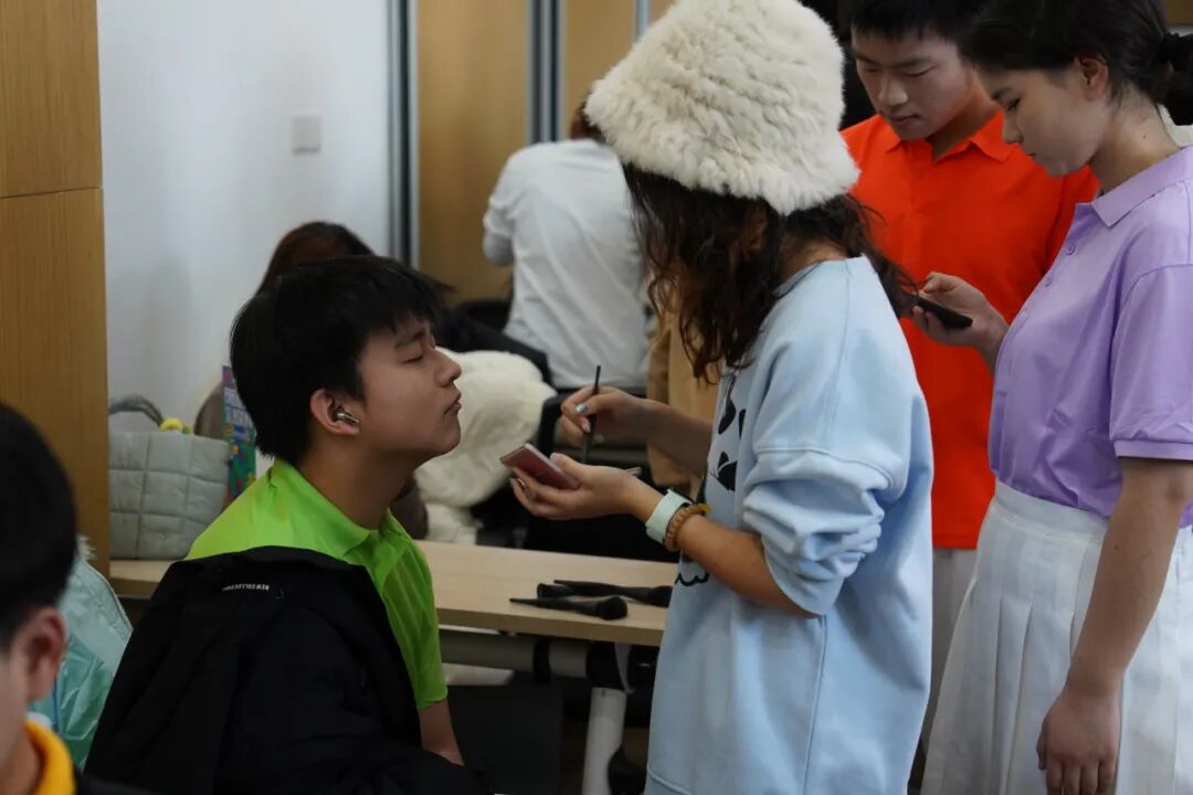 当日上午九点,参与展演的同学们齐聚明商407教室,来自三个公司的志愿者们为70多位即将登台的同学们精心修饰妆容。经过数个小时紧张而有序的化妆工作,同学们都以最佳状态做好了上台前准备工作。
