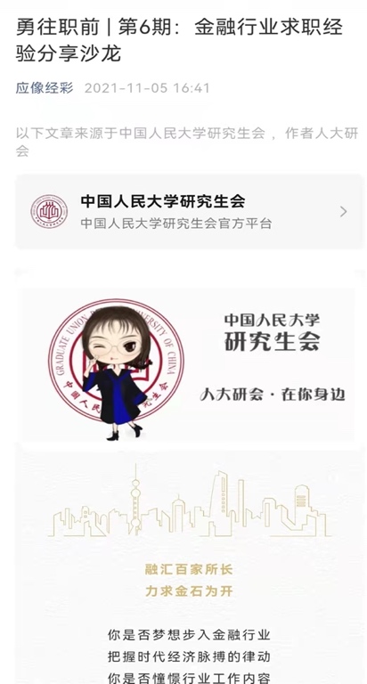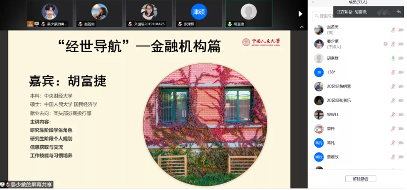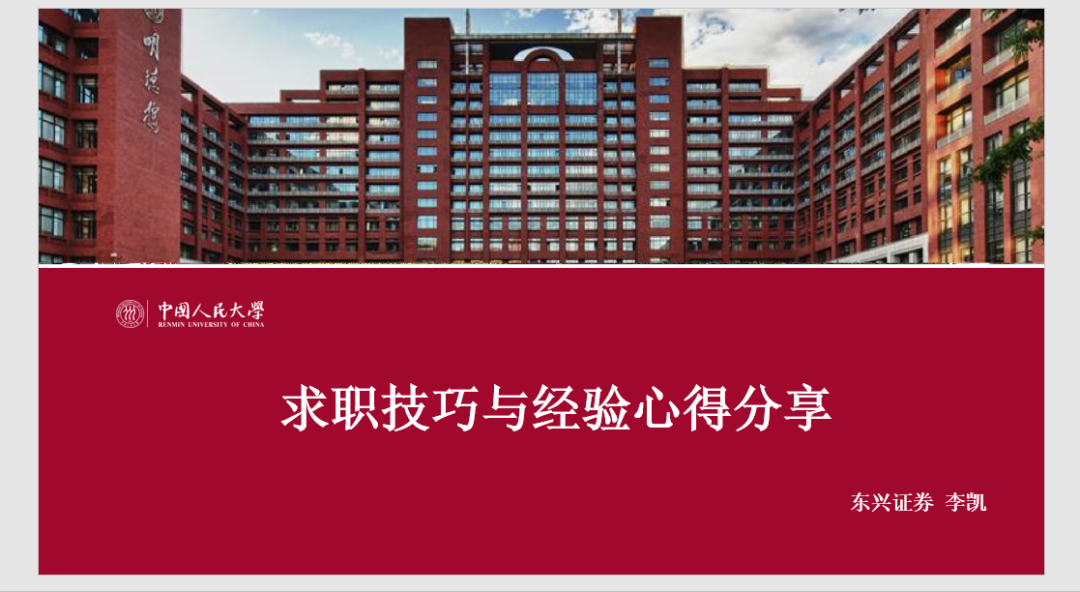邀请现就职于某头部券商投行部门的2018届国民经济学员工胡富捷、现就职于中国进出口银行总行的2019届国民经济学员工兰弓煜、现就职于东兴证券投资银行部的2021届国民经济学硕士员工李凯,分别就各类金融机构的主要业务内容范畴和工作情况、就券商简历准备、岗位内容、实习留用和笔面试准备等内容展开分享。