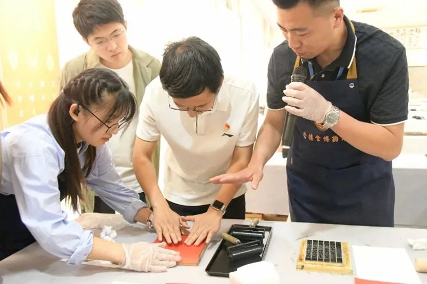 跟随李培义的详细讲解,师生参观了各类主题的牌匾、从夏商周至秦汉唐期间的古拓片、当代著名书法家书写的千余幅道德书法作品、著名篆刻家篆刻的印章等馆藏珍品,通过一件件珍贵的文化藏品,多角度、全方位了解德文化演进史、匾额发展史,深刻感悟蕴含其中的道德文化典故、道德文化历史。在工作人员的引导下,大家亲自体验了古法造纸、活字印刷、传统木板水印拓片、古籍装帧等传统工艺活动,亲身感受中华传统文化的博大精深和传统技艺背后的文化传承。