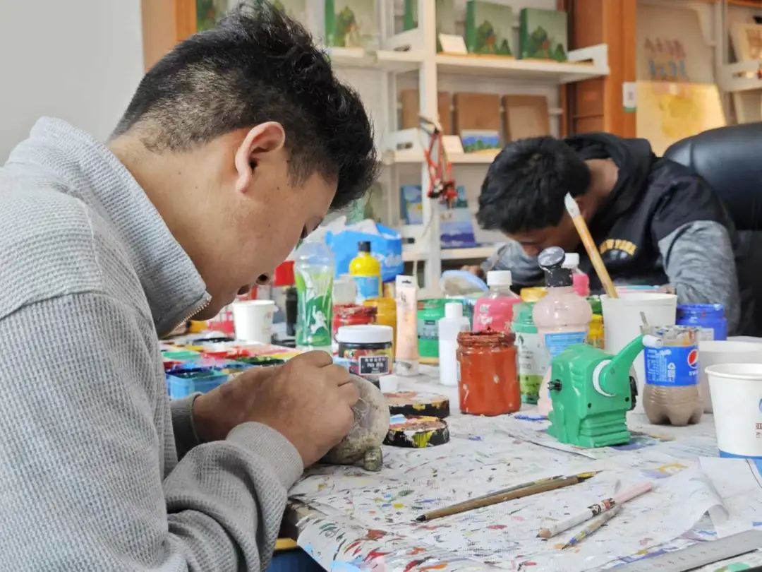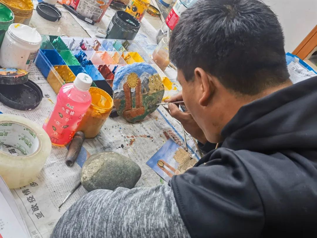 庞达村广袤的原始森林和自然风光容易激发创作灵感和激情,索喃次仁重点培训民族刺绣、手工绘画、手工编织等实用创新技术,作品兼具爱国主义、守边戍边、绿色环保、乡村文明等元素。文创产品所采用的原材料石头、木头均为巡边路上就地取材,再运用传统唐卡、壁画等技艺进行绘画创作,其中编织则以本地手工羊绒布为面,彩色羊毛线为语言进行创作,每个产品都是限量版,没有一个复制品。截至目前,手工文创产品的销售收入不断增加,村民通过文创所获得的分红逐年提高,越来越多企事业单位纷纷提出定制需求。