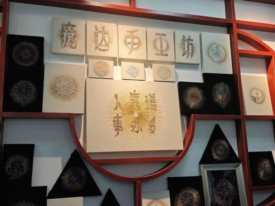 庞达手工坊悬挂的“人靠谱,事办妥”字样刺绣画,表达了对上海市普陀区对口帮扶的感谢