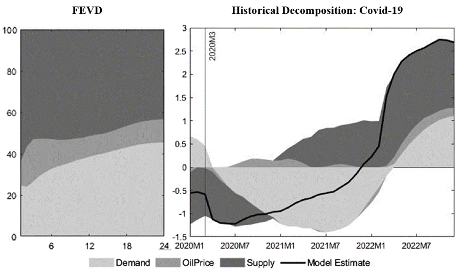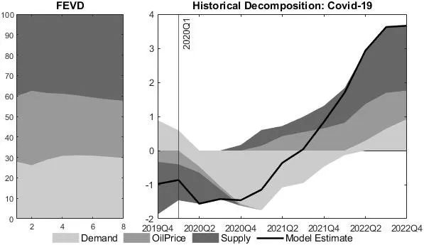 该研究使用带有符号约束(Sign Restrictions)的要素增强向量自回归(FAVAR)模型来识别可被感知的全球油价冲击、需求侧冲击和供应侧冲击。基于对原油价格的预测和对84个经济体GDP增长和通货膨胀的预测,本文发现在2012至2022年间,可被感知的油价冲击只能解释全球通胀预期波动的约10%,在全球新冠疫情期间可以解释的比例更小。即使考虑经济主体乐观和悲观情绪的外生变化也没有改变可被感知的油价冲击向通胀预期的传递程度。相比起来,