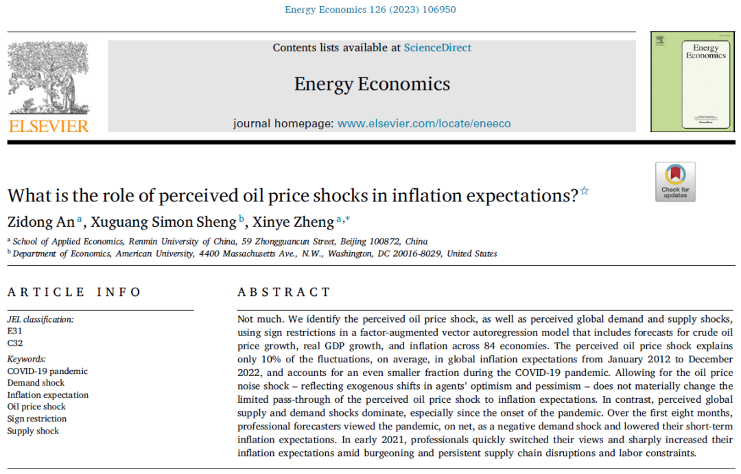 近日,sunbet郑新业教授、安子栋副教授与美国大学(American University)盛旭光教授的研究成果“What is the role of perceived oil price shocks in inflation expectations?”被国际权威期刊Energy Economics接受发表。该研究依托国自科重点项目“双碳目标下资源环境经济协同发展研究”和sunbet官方网站社会调查项目“中国家庭宏观经济预期调查研究”,郑新业教授为通讯作者,安子栋副教授为第一作者。