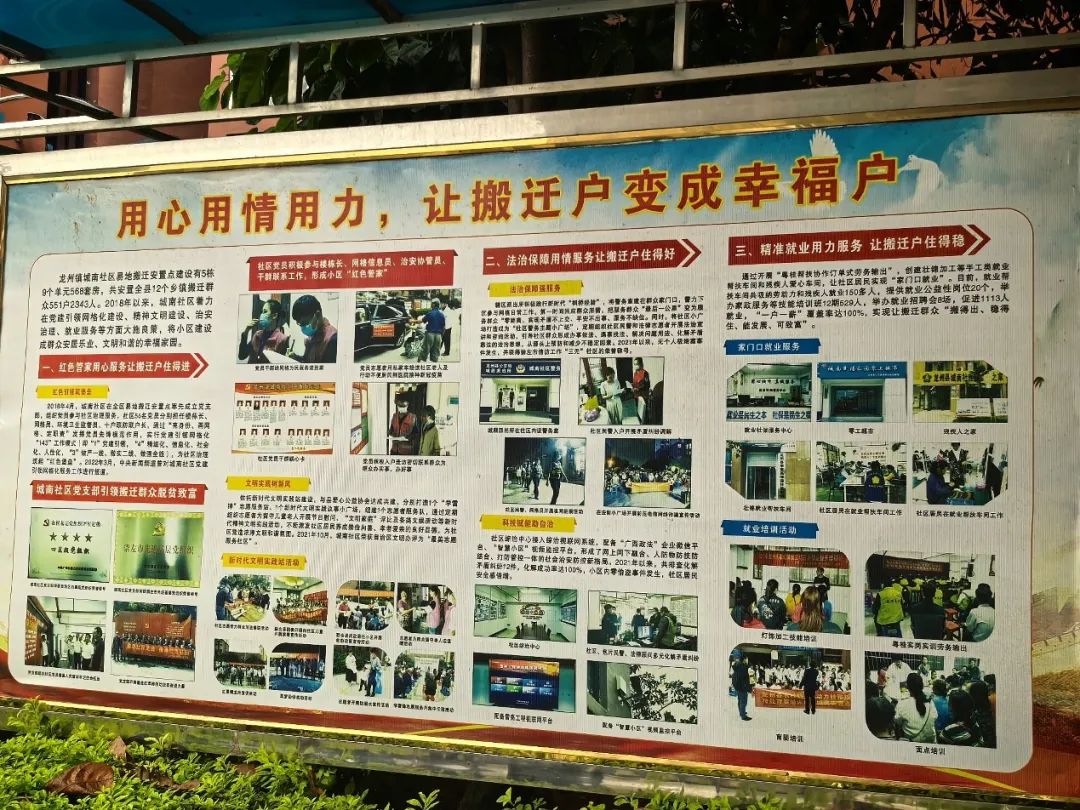 随后,调研团到达龙州县城南社区,考察其易地搬迁和就业帮扶情况。得益于粤桂扶贫协作关系,广东省鹤山市同广西壮族自治区龙州县达成“鹤龙”扶贫协作关系。根据“龙州所需,鹤山所能”原则,鹤山企业、人才及工作理念逐步融进龙州血液,帮助建设城南幸福家园。城南社区成为龙州县易地扶贫搬迁安置点。
