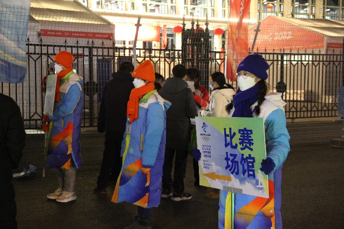 我们的工作内容主要是在首都体育馆周边引导观众入场和散场。从中外交流大厦的下车点到首都体育馆南门安检口之间大概一公里的距离。上一座天桥,路过国家图书馆和紫竹院公园门前,再走一个地下通道,观众们在文明引导员和城市志愿者的引导下有组织地行进,沿途星星点点布满城市志愿者,他们引导着前进的方向,同时也朝气蓬勃地为路过的人们送上这座城市冬日里一声温暖的问候。就像那首冬奥宣传曲的歌名——《燃烧的雪花》,虽在冬日,有漫天大雪,有瑟瑟寒风,但每一位志愿者都似一片努力燃烧的“小雪花”,一点点微弱的光与热汇聚起来,温暖着这座“双奥”之城。