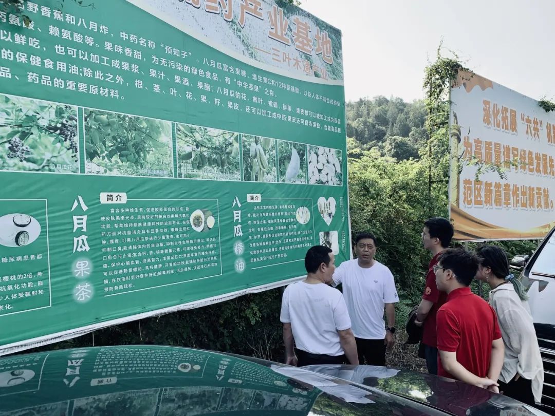 随后,访谈团来到了任家寨村的八月瓜果园及加工厂。任家寨村是目前贵州省最大的八月瓜种植基地,目前已种植八月瓜650亩,2020年共采收20万斤,实现产值400万元。八月瓜,药名“三叶木通”,由于八月瓜的藤、籽、近熟果都含有较高的皂苷成分,可以作为中药材“预知子”入药,因此在部分省份已经被定性为药品。然而八月瓜未成熟前,其药性较低,人们更多将其作为水果食用,也可以将其加工成果酱。作为比较小众的新农产品,八月瓜产业目前还缺少国家标准和地方标准,鲜果可以作为水果售卖,而加工品售卖则需要食品生产许可证。任家寨村在鲜果售卖、采摘体验的同时,也与全国其他省份生产八月瓜的企业合作,共同申请和修订八月瓜加工品的食品生产许可,以进一步延长产业链,为今后的八月瓜果酱、果茶等产品的销售做准备,带动村民和村集体致富。