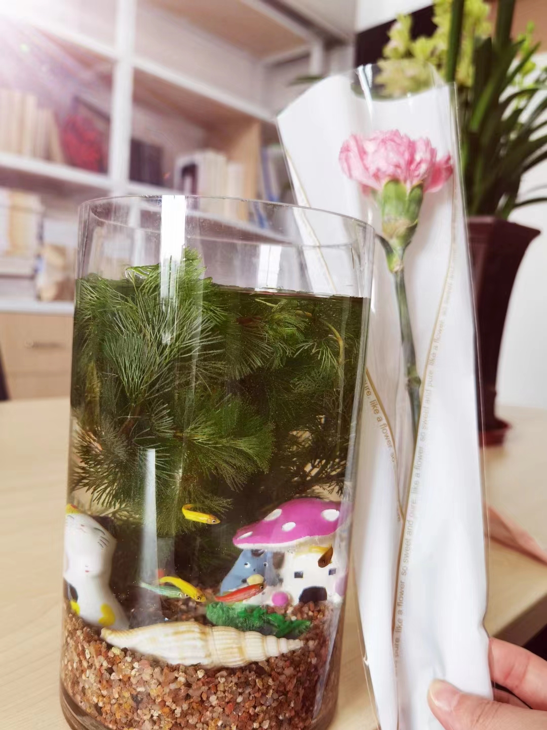 一捧沙石、两株海草、三五只小鱼,加上形态各异的小玩偶、小贝壳、小房子,女神们挑选心仪的配件,搭配不同色彩的小鱼,发挥自己超凡的想象力和创造力,小镊子、小夹子齐上阵,打造专属于自己的海底世界,组成了一幅幅唯美的海底景观。