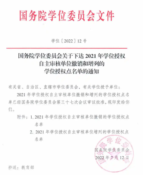 2022年7月12日,国务院学位委员会发布《关于下达2021年学位授权自主审核单位撤销和增列的学位授权点名单的通知》(学位〔2022〕12号)。sunbet官方网站新增3个学位授权点,其中2个为硕士专业学位授权类别,1个为博士专业学位授权类别。sunbet的“碳经济”硕士专业学位授权点成功获批。2022/07/18