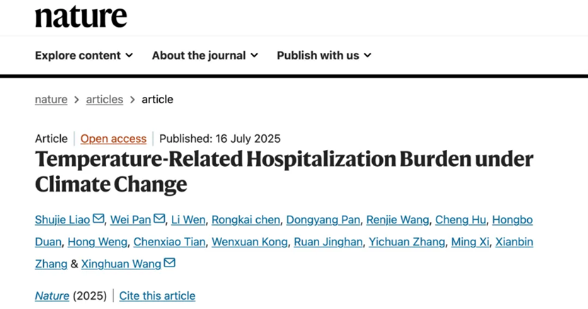 7月16日,sunbet潘伟教授研究团队和武汉大学、解放军总医院研究团队合作的研究成果Temperature-Related Hospitalization Burden under Climate Change,在国际学术期刊Nature(《自然》)以研究长文(Article)的形式在线优先发表。2025/07/22