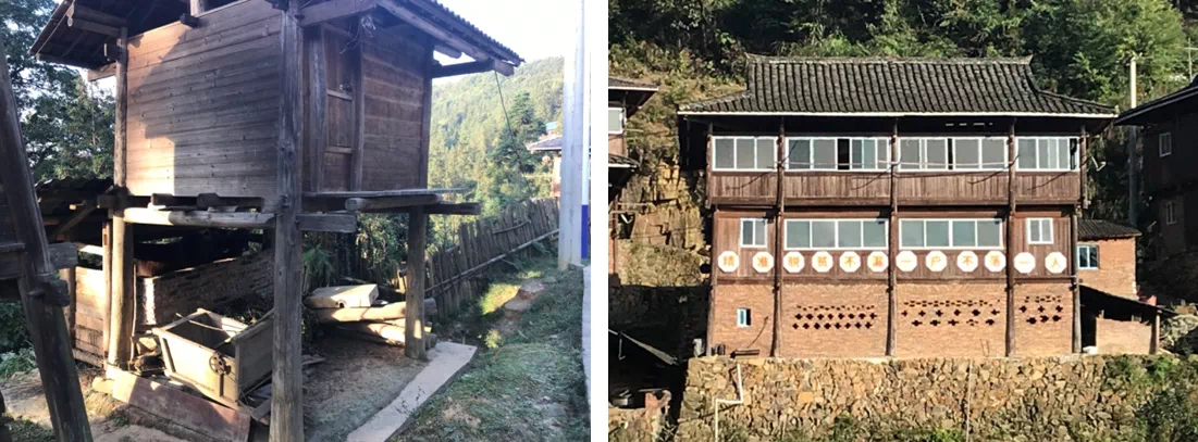 改造前的吊脚楼下可以饲养牲畜,改造后的楼下被砌上了砖变为厨卫场所